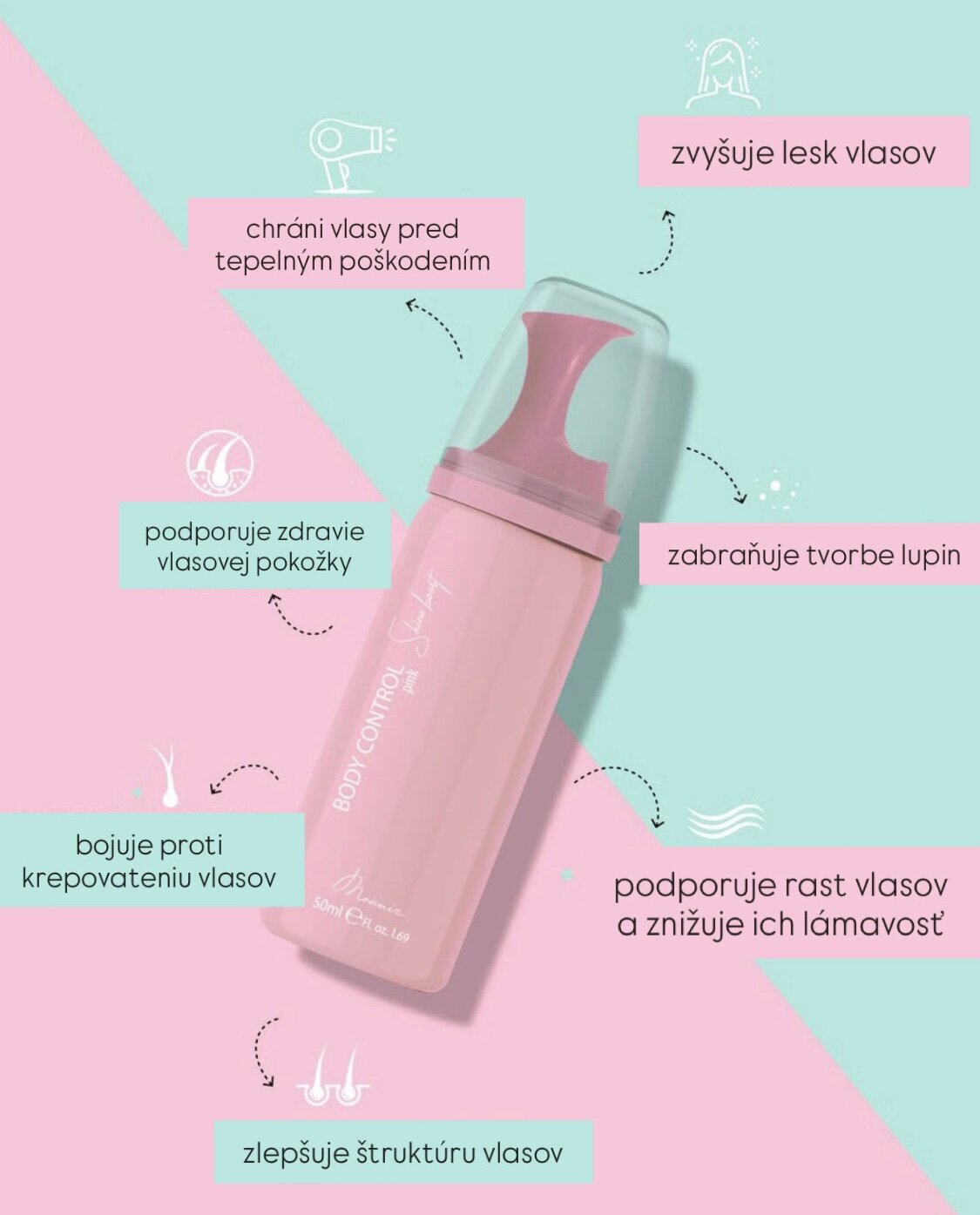 Tato novinka v podobě pěnového ošetření obsahuje tři typy olejů: sójový olej, olej z pšeničných klíčků a slunečnicový olej. Všechny tyto oleje obsahují vitamín E, životně důležitou živinu pro udržení zdravé pokožky hlavy. Vitamin E také hraje klíčovou roli při posilování a hydrataci vlasových kořínků, zvyšuje hustotu vlasů a chrání je před škodlivými účinky slunečního tepla. Kromě toho tato léčba obsahuje degradovaný keratin, přírodní protein, který se vyskytuje ve vlasech. Tento přírodní protein účinně minimalizuje krepovatění vlasů, zachovává tloušťku vlasů a dodává vlasům hladkost a lesk. Ošetření "Shine Boost Body Control" značky Mounir Products je dostupné ve čtyřech podmanivých barvách: akvamarinová, růžová, fialová a meruňková.